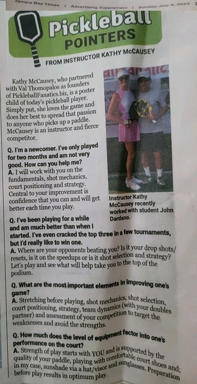 Our own Kathy McCausey was highlighted in July, 2023, in the Tampa Bay Times. A wealth of knowledge, Kathy answers some of the more popular questions that come up in her pickleball lessons.